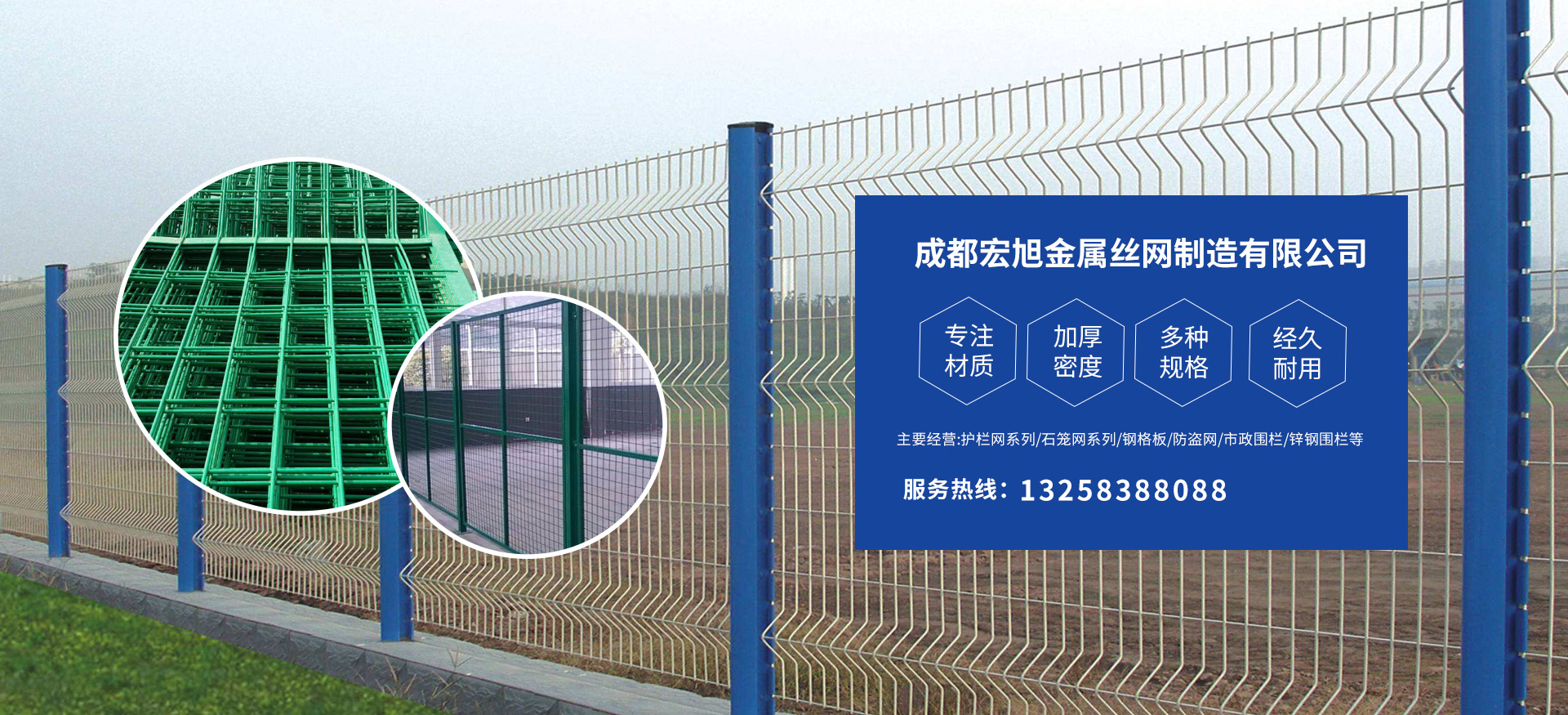 成都宏旭金屬絲網(wǎng)制造有限公司主營護(hù)欄網(wǎng)系列、石籠網(wǎng)系列、鋼格板、防盜網(wǎng)、市政圍欄、鋅鋼圍欄、鋼筋網(wǎng)片、聲屏障系列、波形護(hù)欄板、柔性纜索護(hù)欄、SNS邊坡防護(hù)網(wǎng)等其他絲網(wǎng)類產(chǎn)品。特殊規(guī)格可加工定做,也可根據(jù)客戶來圖來樣定做。自創(chuàng)業(yè)以來,公司一直堅持市場為導(dǎo)向,以客戶為根本,以實(shí)業(yè)為基礎(chǔ),以技術(shù)為支持,以科研為后盾,集科研、生產(chǎn)、經(jīng)營為一體,不斷研制開發(fā)新產(chǎn)品,開拓市場,走綜合發(fā)展之路。多年來,公司憑借過硬的質(zhì)量,良好的信譽(yù)、優(yōu)質(zhì)的服務(wù)、合理的價格,贏得了市場和商家的一致好評。